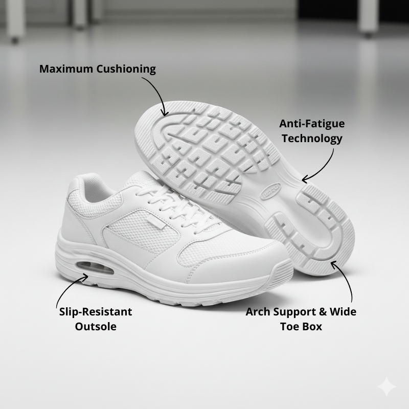 Standing for 8, 10, or 12-hour shifts takes a serious toll on your body. Regular work shoes don't provide the cushioning and support your feet need, leading to pain that radiates through your legs, hips, and back.
